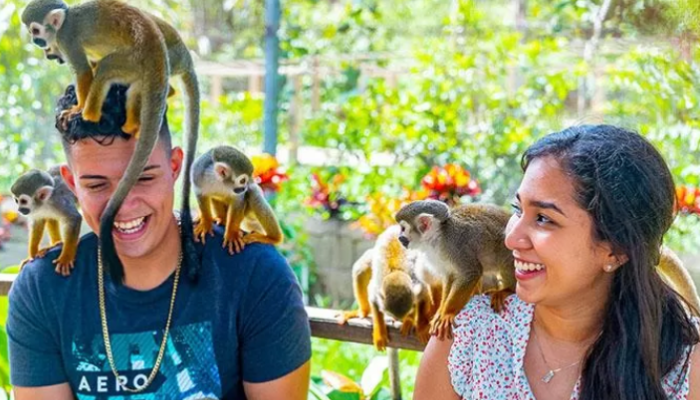 De ahí pasaremos a Monkeyland, inmerso en la jungla tropical. Podremos apreciar los diferentes sonidos de la naturaleza mientras vemos a los muy curiosos monos ardilla. Nuestro personal calificado les dará un plato de frutas para poder alimentar a los monos. Estas muy curiosas criaturas les llaman la atención los diferentes objetos, por eso te recomendamos guardar muy bien tus objetos personales o los tomarán prestados para jugar más tarde. Esta es una gran oportunidad para conocer y aprender sobre estas hermosas criaturas.